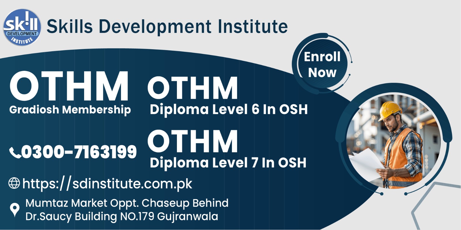 If you are planning to build a strong career in Occupational Health and Safety and want an internationally recognized qualification, OTHM Level 6 and Level 7 Diploma in Occupational Health and Safety is the right choice for you. Skills Development Institute Gujranwala offers professional training designed for students who want to work in Pakistan as well as Gulf countries.